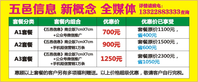 《五邑信息》商企版7cmX7cm+公众号微信推广+手机短信营销1万条