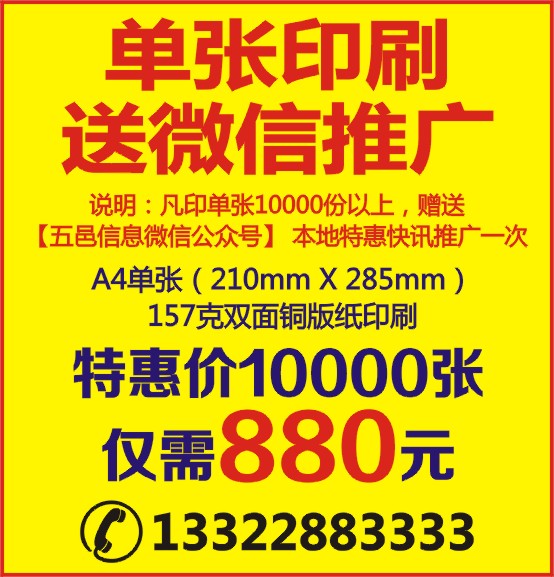 说明:凡印单张10000份以上,赠送【五邑信息微信公众号】 本地特惠快讯推广一次