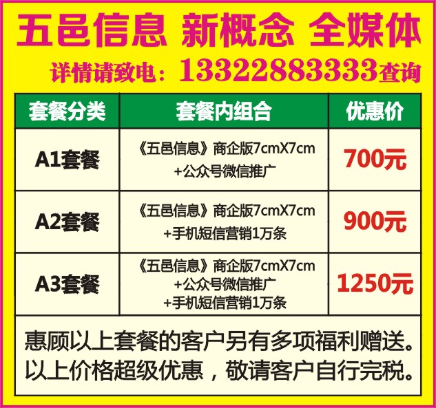 《五邑信息》商企版7cmX7cm+公众号微信推广+手机短信营销1万条