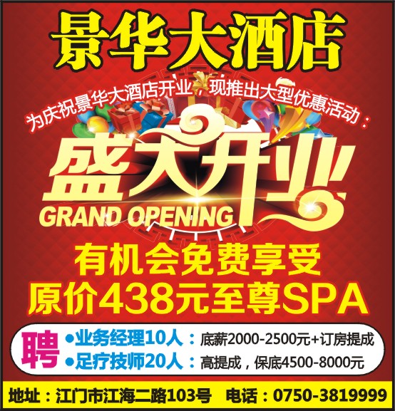 为庆祝景华大酒店开业,现推出大型优惠活动: