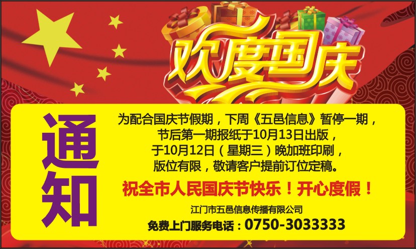 为配合国庆节假期,下周《五邑信息》暂停一期,节后第一期报纸于10月13日出版,于10月12日(星期三)晚加班印刷,版位有限,敬请客户提前订位定稿。
