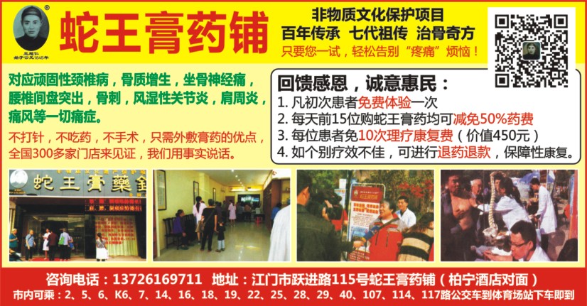 咨询电话:13726169711 地址:江门市跃进路115号蛇王膏药铺(柏宁酒店对面)