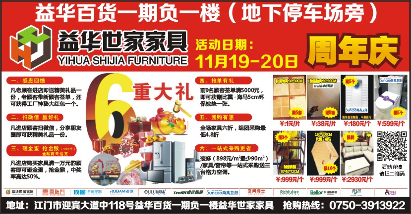 地址:江门市迎宾大道中118号益华百货一期负一楼益华世家家具 抢购热线:0750-3913922
