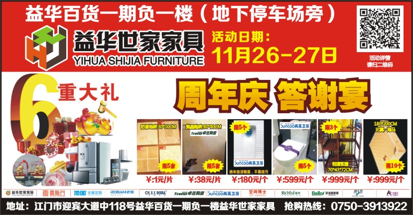 地址:江门市迎宾大道中118号益华百货一期负一楼益华世家家具 抢购热线:0750-3913922