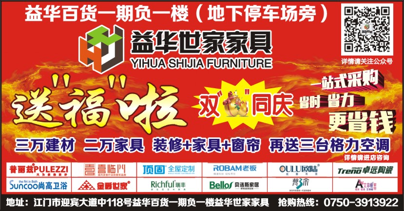 地址:江门市迎宾大道中118号益华百货一期负一楼益华世家家具 抢购热线:0750-3913922