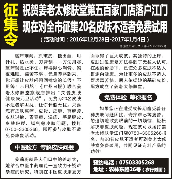 瘙痒难耐,抓破皮、挠出血、用针扎、热水烫、刀背刮……方法用尽,瘙痒就是止不住。痒得揪心刺骨、彻夜难眠、痛苦不堪。元旦即将到来,你还想让皮肤问题困扰你的长假?不用等!不用熬!《广州日报》联合姜老太修肤堂旗舰店推出“关爱皮肤健康庆元旦活动”,免费为20名皮肤不适者解困扰,让你长假无忧。只要您有皮肤瘙痒、皮炎、皮癣、荨麻疹,皮肤过敏、青春痘、湿疹、手足脱皮、皮肤皲裂、脚气等皮肤问题,拨打0750-3305268,即可参与皮肤不适免费康复活动。