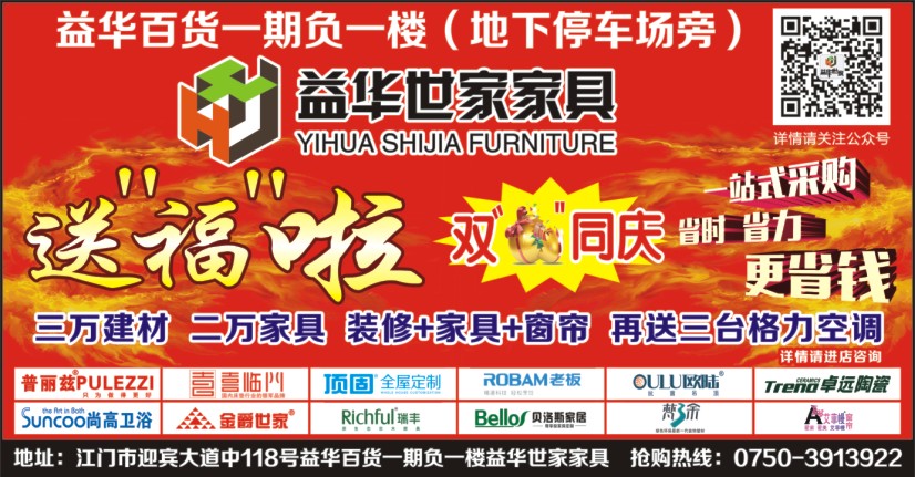 地址:江门市迎宾大道中118号益华百货一期负一楼益华世家家具 抢购热线:0750-3913922