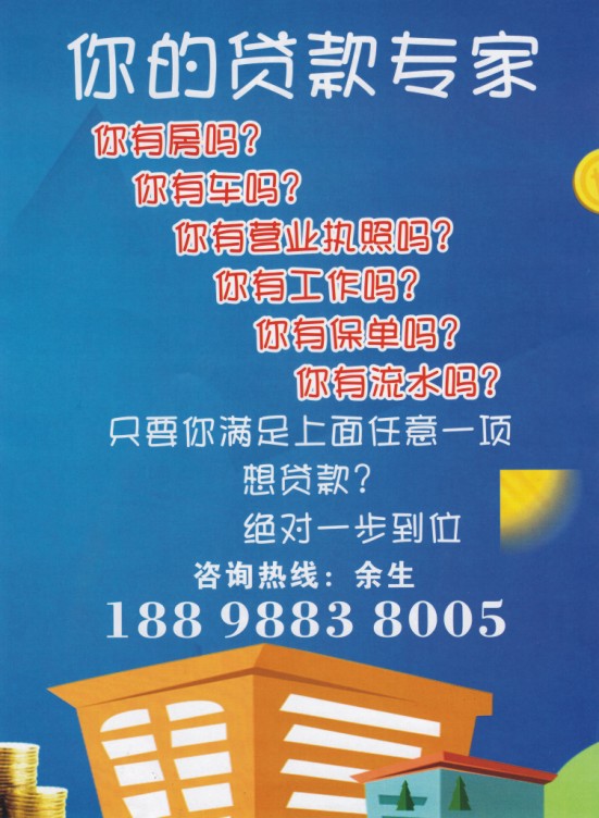 让小额借贷不再难 有车即可借款 快至1小时到帐 门槛低 有车即可借款 不押车 款借走 车照开 到帐快 当天到帐 快至1小时 额度高 可借估值 高达100% 你的贷款专家 你有房吗? 你有车吗? 你有营业执照吗? 你有工作吗? 你有保单吗? 你有流水吗? 只要你满足上面任意一项 想贷款? 绝对一步到位 咨询热线:余生 18898838005