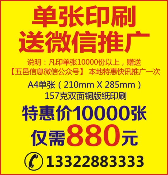 说明:凡印单张10000份以上,赠送【五邑信息微信公众号】 本地特惠快讯推广一次