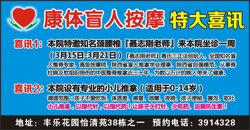 本院特邀知名颈腰椎『聂志刚老师』来本院坐诊一周(3月15日-3月21日)『聂志刚老师』聂氏三正法创始人、全国知名盲人整脊专家、高级按摩师、陕西省盲人推拿学会理事、陕西省自强模范。从事脊柱病及软组织损伤的中医整脊推拿近三十年,为数以万计的病人带来了健康。