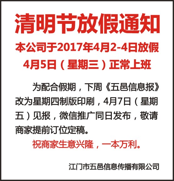 为配合假期,下周《五邑信息报》改为星期四制版印刷,4月7日(星期五)见报,微信推广同日发布,敬请