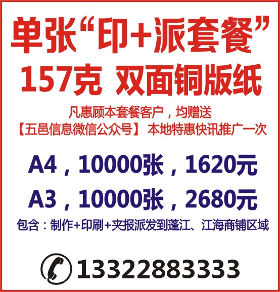 凡惠顾本套餐客户,均赠送【五邑信息微信公众号】 本地特惠快讯推广一次