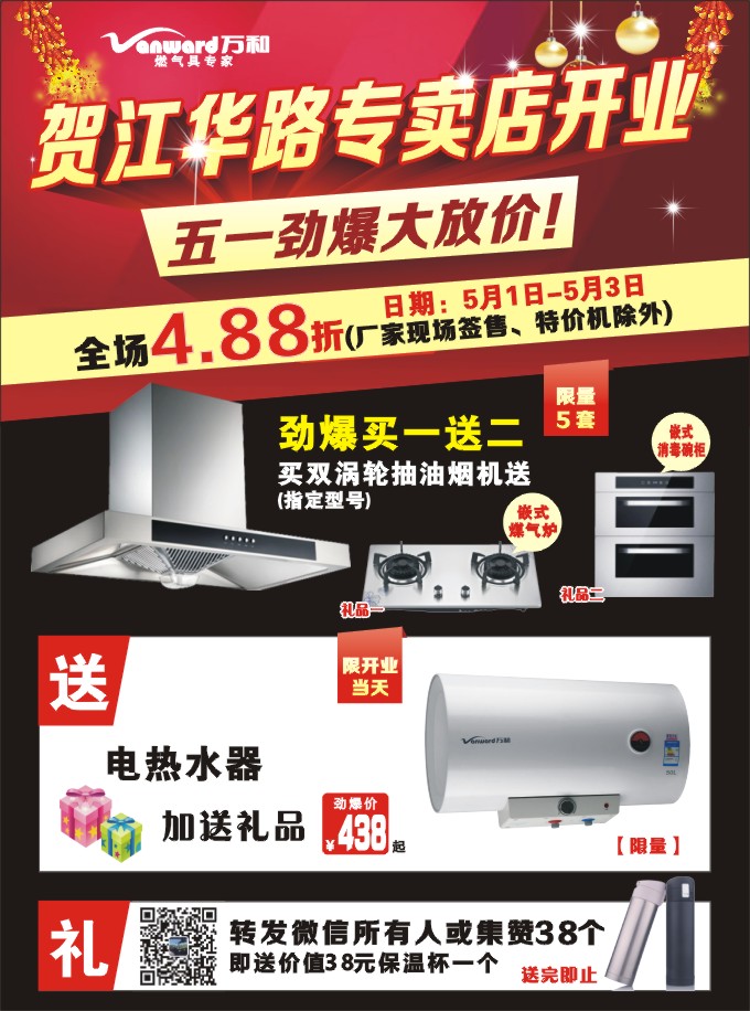贺江华路专卖店开业 五一劲爆大放价! 日期:5月1日-5月3日 全场4.88折(厂家现场签售、特价机除外) 劲爆买一送二 买双涡轮抽油烟机送(指定型号) 送电热水器 加送礼品 转发微信所有人或集赞38个 即送价值38元保湿杯一个,送完即止