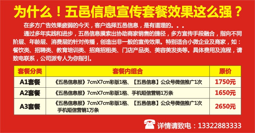通过多年实践和进步,五邑信息摸索出协助商家销售的捷径,多方宣传手段融合,指向不同阶层、年龄层、消费层的针对传播,创造出非一般的宣传效果。特别适合小微企业及商家,如:餐饮类、招聘类、教育培训类、招商招租类、门店产品类、美容美发类等。具体费用及流程,请致电联系,公司派专人为你指引。
