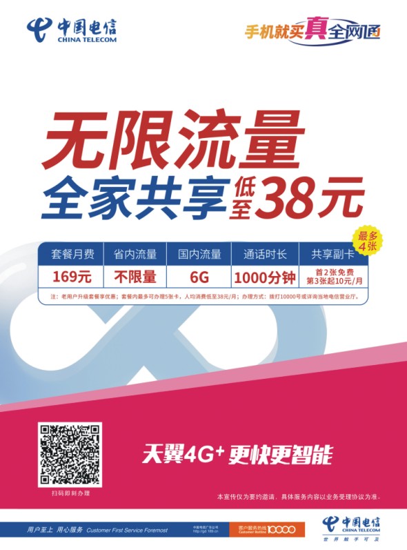 注:老用户升级套餐享优惠;套餐内最多可办理5张卡,人均消费低至38元/月;办理方式:拨打10000号或详询当地电信营业厅。