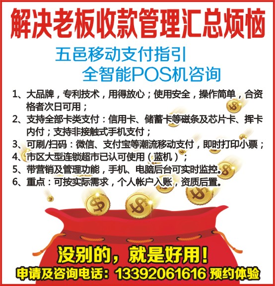 2、支持全部卡类支付:信用卡、储蓄卡等磁条及芯片卡、挥卡内付;支持非接触式手机支付;