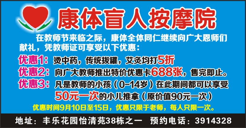 优惠3:凡是教师的小孩(0-14岁)在此期间都可以享受50元一次的小儿推拿(原价值90元一次)