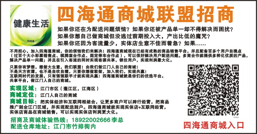 互联网时代的发展,只有强强联手才能实现共赢!四海通商城就是你们的优选平台。共享平台,做江门人自己的商城。
