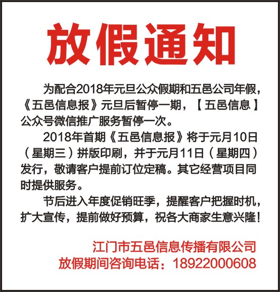 为配合2018年元旦公众假期和五邑公司年假,《五邑信息报》元旦后暂停一期,【五邑信息】公众号微信推广服务暂停一次。